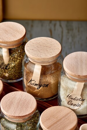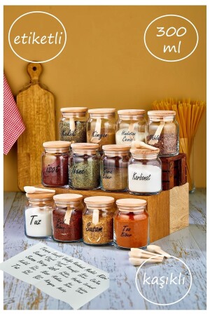 12'li Kapağı Kendinden Kaşıklı Ve Etiketli Baharatlık Seti 300 ml Gold Etiketli Cam Baharat Takımı