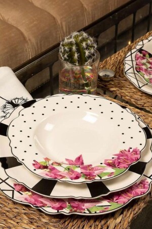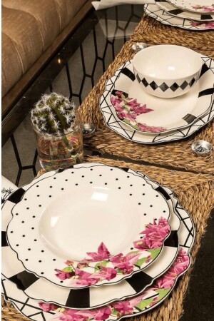 محتويات المنتج: 6 أطباق شحن 31 سم، 6 أطباق خدمة 27 سم، 6 أطباق العشاء 23 سم، 6 أطباق الكعك 19 سم، 6 أكواب 14