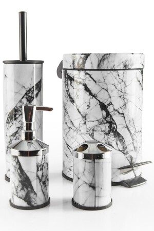 5 Parça Mermer Desen Mat Banyo Seti - Wc Fırçalık- Sıvı - Katı Sabunluk- Çöp Kovası- Diş Fırçalık