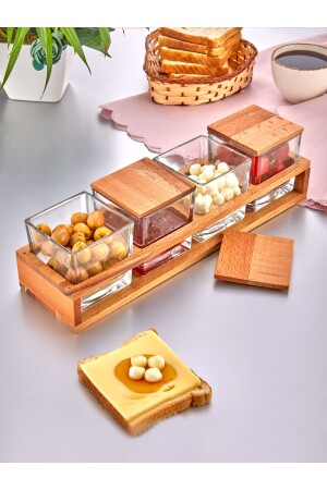 Bella Tepsili 6'lı Ahşap Vakumlu Kapaklı Cam Kahvaltılık Çok Amaçlı Cam Çerezlik 235 ml