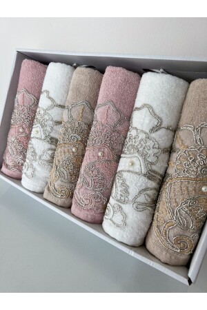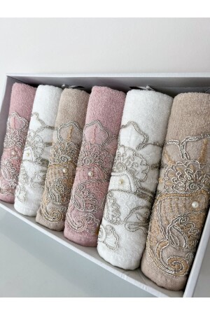Güpürlü Saten Işleme Desenli Kutulu Lüks Çeyizlik 50x90 6'lı El Yüz Havlu Seti
