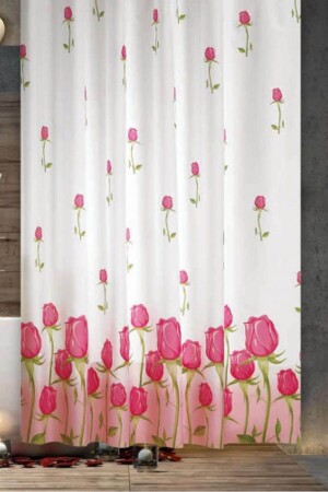 Gül Desen Banyo Perdesi Askı Hediyeli 180x200cm Tek Kanat Beyaz Kırmızı Duş Perdesi- L Boru Hediyeli