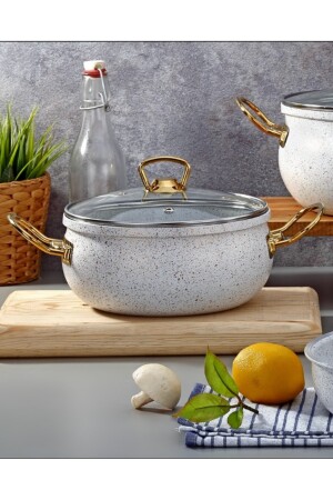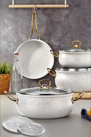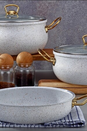 Bio Granit 7 Prç Istiridye Fildişi & Gold Kulp Tencere Ve Tava Seti EVTGR7PRÇEZMFİLDİŞİ