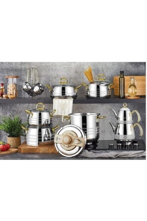 MNZ-Acar Plus Akasya Gold 18 Piece Steel Pot Dowry Set 20x10 cm Deep Pot 2.6 lt 22x12 cm Deep Pot 3.5 lt 24x12 cm Deep Pot 4.5 lt 24x8 cm Flat