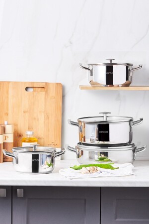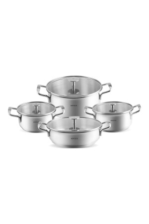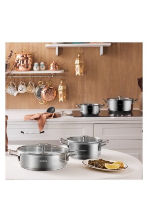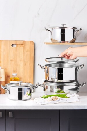 مجموعة طهي من 8 قطع من الفولاذ من MNZ-Karaca Alaz 8-piece Kitchenware Set مع قاعدة إدراجة مجموعة طهي من 8 قطع من الفولاذ من خلال توز
