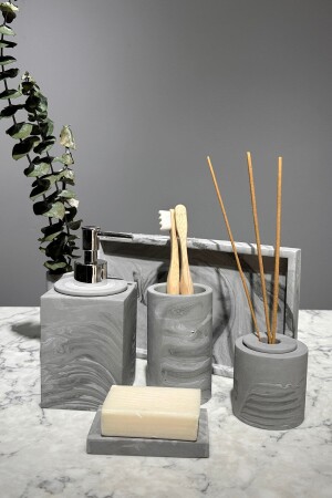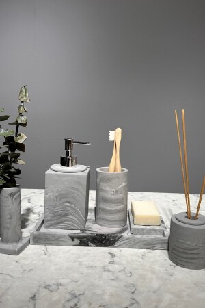 5 Parça Mermer Desen Mat Banyo Seti - Wc Fırçalık- Sıvı - Katı Sabunluk- Çöp Kovası- Diş Fırçalık