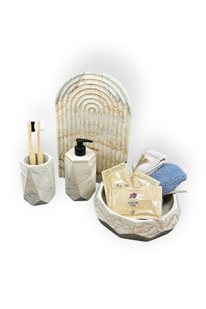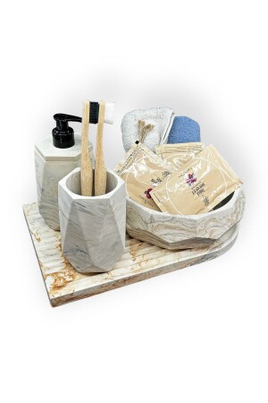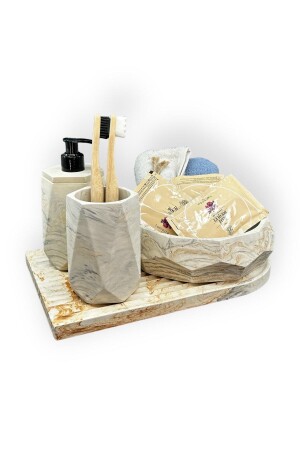 5 Parça Mermer Desen Mat Banyo Seti - Wc Fırçalık- Sıvı - Katı Sabunluk- Çöp Kovası- Diş Fırçalık