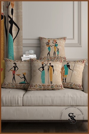 Afrika Temalı Kırmızı Sarı Renklerde Hediyelik 4'lü Dijital Baskılı Koltuk Kırlent Kılıfları