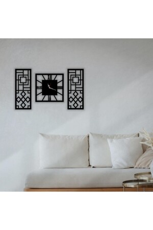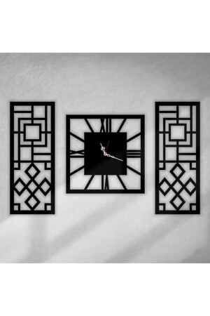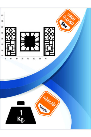 تم إنتاج المنتج من 3 ملي متر MDF. الجزء الوسط للساعة هو 33 سم x 33 سم ، والأجزاء الزخرفية على اليمين واليسار هي 20 سم x 50 سم كل.