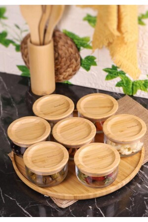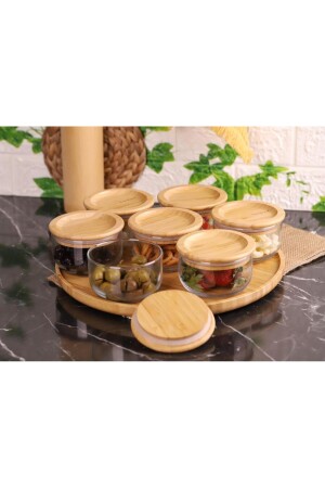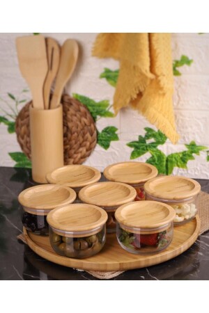 Bella 10 Parça Tepsili Ahşap Vakumlu Kapaklı Cam Kahvaltılık Çok Amaçlı Cam Çerezlik 235ml