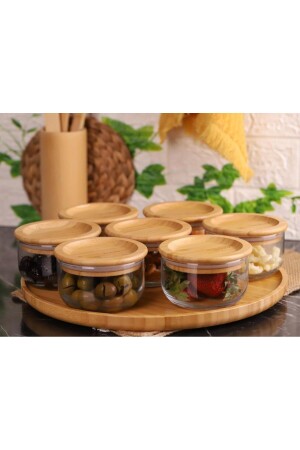 Bella Tepsili 6'lı Ahşap Vakumlu Kapaklı Cam Kahvaltılık Çok Amaçlı Cam Çerezlik 235 ml