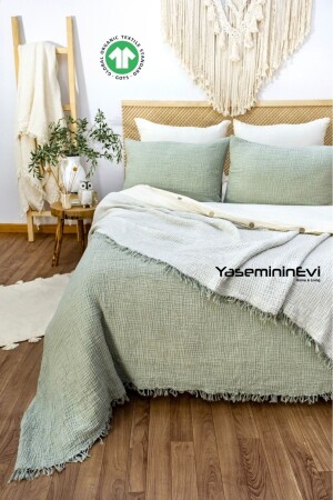 MNZ-Green - Ecru King Size غطاء السرير 4 طبقات المسلين 100% القطن