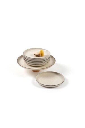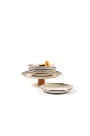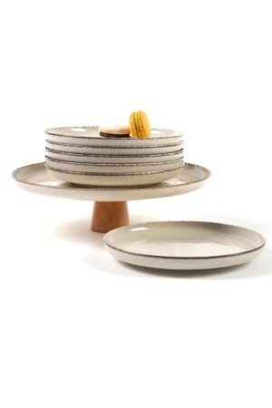 MNZ-Kütahya Porcelain Pearl 7 Piece Cake Set مع ساقي خشبية، قطعة واحدة من 27 سم كوكي كوكي خدمة طبق مع ساقي خشبية، 6 قطع