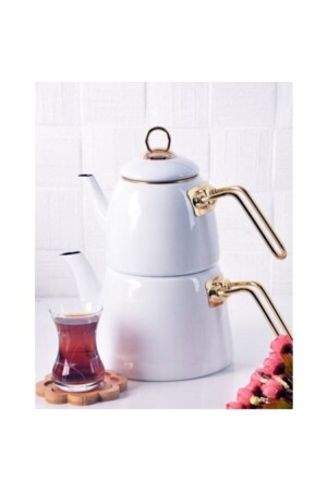 Nv10055 Porselen Demlikli Beyaz Emaye Çaydanlık Takımı