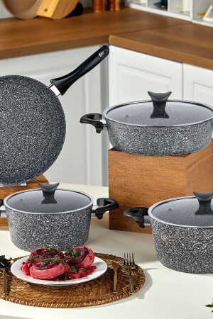 مزارع طباخ من طراز MNZ-Taç Master Cook 4-piece 7-piece Granite Saucepan Set Gray 20 cm Deep Saucepan (2.3 لتر) 24 cm Deep Saucepan (3.