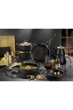 MNZ-Maya 11 قطعة غرانيت نمط المطبخ مجموعة الذهبية المقبض الأسود maya11pcs