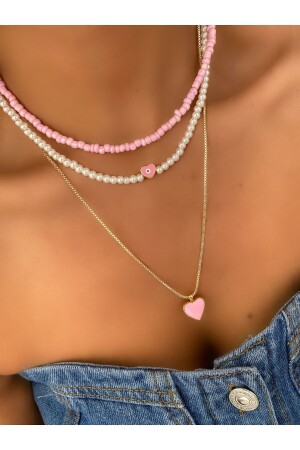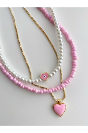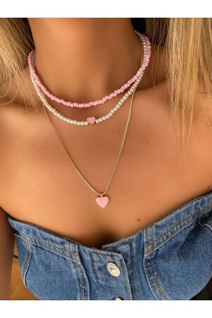 MNZ-Pink Enameled Heart Pearl Detail ثلاثي مجموعة عنق / امرأة عقدة عنق متعددة مجموعة