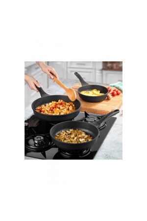مكونات المنتج من علبة من الحديد الاصطناعي من نوع MNZ-Amboss Quartz 3 Piece Black Cast Iron Pan Set • 28 سم Pan • 24 سم Pan • 20 سم