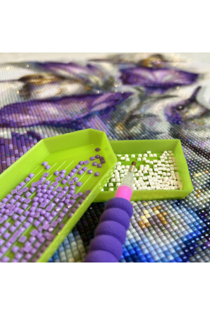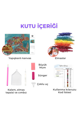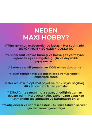 محتويات صندوق MNZ: الماسات، والقماش مع رسم المخططات وطبقة الملصقة، والقلم الخاص، والقلم، والصفحة، والشمعة الكبيرة +