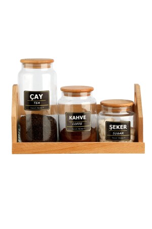 (MNZ-Tea, Coffee And Sugar Glass Jar Set) - غطاء خشبي فراغ وموقفة ومعلامة - LuxSeri