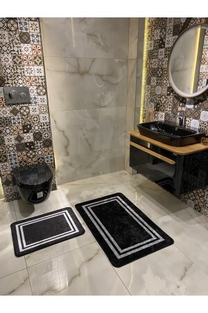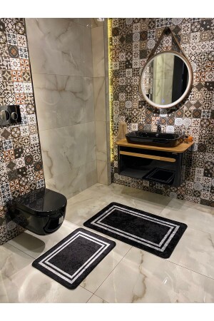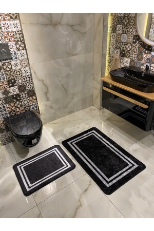 Lazer Kesim Peluş 2'li Oval Siyah Banyo Paspas Takımı