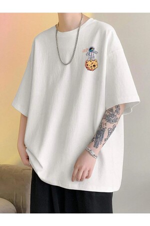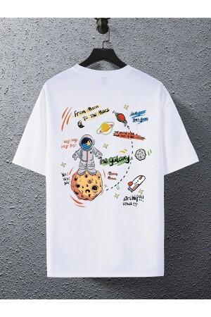 MNZ-Unisex White Planet طباعة مقاس كبير قميص عنق الطاقم BN-1533