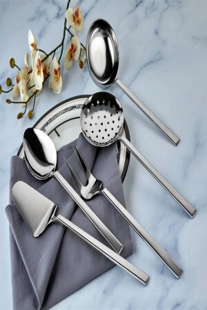 Sade 5 parça natural servis takimi kepçe kevgir seti 304 kalite 18/10 paslanmaz çelikten üretilmiştir. Paslanma Ve Kararma yapmaz. Sade(parlak) yüzeylidir. Bulaşık makinesinde yıkanabilirler. 1 adet Kepçe 1 adet Servis Kaşık 1 adet Servis Çatal 1 adet Spatula 1 adet Kevgir