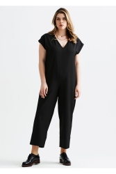 Schwarzer Damenoverall mit weitem Bein und V-Ausschnitt in Übergröße 65N37634