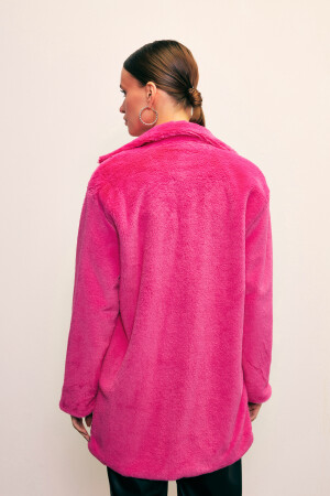 Gerader Kragen – lange Ärmel – bis zur Hüfte – Taschen – Futter mit Leopardenmuster – Plüschmantel. Höhe: 82 cm. Das Produkt des Modells hat Größe 36/S. Modellmaße: Größe: 1–76 – Brustumfang: 83 – Taille: 60 – Hüfte: 90