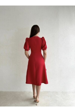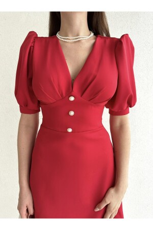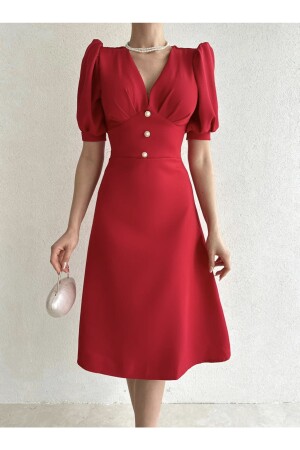 Rotes Midikleid mit halblangen Ärmeln und Perlenknöpfen