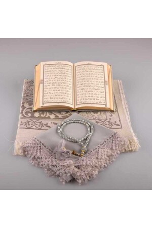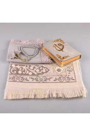 Şal - Seccade - Tesbih - Kuran Hediye Seti (çanta Boy- Kadife- Gri)