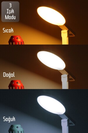 3 Renk Tonlu (Soğuk-Doğal-Sıcak) Doğal Beyaz: 40 00 K Sıcak Beyaz: 6500 K Soğuk Beyaz: 3000 K Dokunmatik Masa Lambası Dokunmatiğe tek dokunma ile ışıklar arasında geçiş yapabilirsiniz. Dokunmatiğe basılı tutarak ışık şiddetini ayarlayabilirsiniz. USB Kablo ile şarj olmaktadır. Mavi Işık Filtresi Bulunmaktadır. Işığı Kırpma Yapmaz. Tek Şarjla Orta/Düşük ışıkta 8 saat çalışabilmektedir. Işık Şiddeti: 400 lümen Batarya Kapasitesi: 2000 mAh Led gücü: 4 Watt 10 adet beyaz 10 adet sarı toplam 20 Adet LED'den oluşmaktadır. Üzerinde Telefon veya Tablet tutturabileceğiniz Stand çentiği bulunmaktadır.