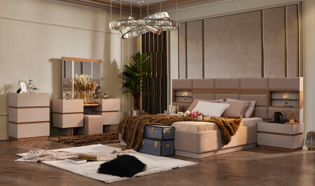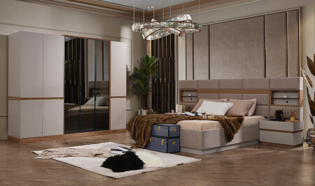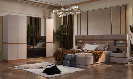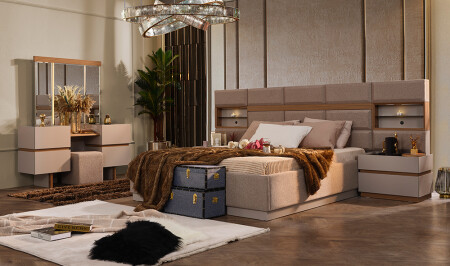 - 6 kapılı dolap - bazalı karyola ve başlık 160 cm - şifonyer ve ayna - 2 adet komodin - puf fiyata dahildir