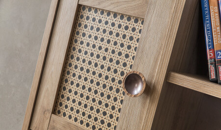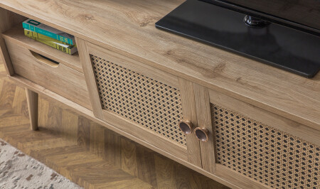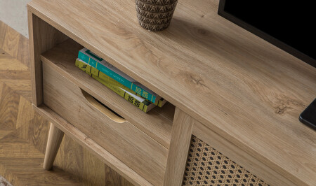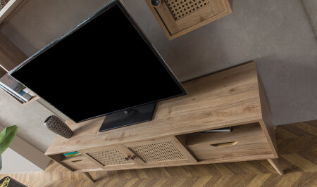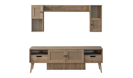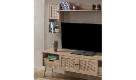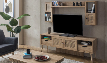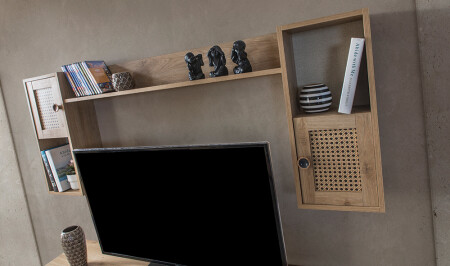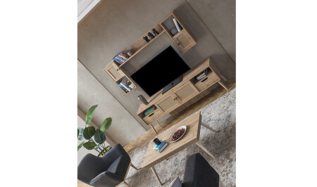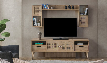 - Alt kapaklı, çekmeceli ve üst dolaplı, raflı tv ünitesi