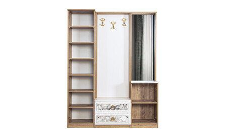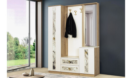 Geniş raflı, çekmeceli, mermer desenli ve aynalı portmanto modeli