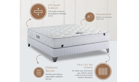- Kesintisiz yay örgüsüyle tam anlamıyla yaylanma efekti sağlarken bedeni destekleyen görkemli bir yatak. Mira coil yay sistemi, doğal liflerden oluşan hipoalerjenik dokuma kumaş