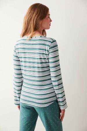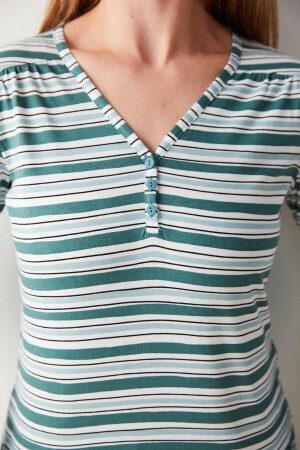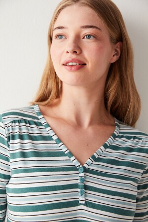Beden: 36 Boy: 180 cm, Göğüs: 90 cm, Bel: 67 cm Kalça: 95 cm%100 pamuklu kumaşıyla yumuşacık hissettiren, evde geçirdiğin her anda konforu ve rahatlığı yaşatan, çizgili deseniyle şık görünümü ev giyim stiline taşıyan Green Striped Tişört.Ana Kumaş:PAMUK %100