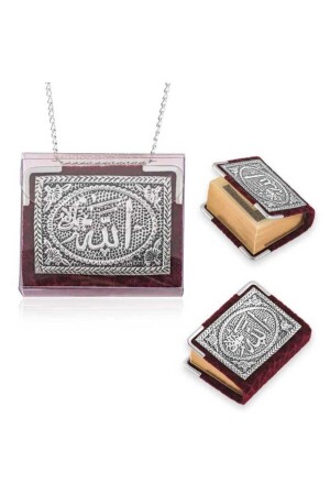 Gümüş Zincirli Küçük Kur'anı-ı KerimKur'an-ı Kerim- İslam dininin ana kitabıdır. Müslümanlara göre- Kur'an ayetleri Allah tarafından Cebrail adındaki melek aracılığıyla İslam peygamberi Muhammed'e vahiyler halinde indirilen bir kutsal kitaptır.İslam inancında- Kur’ân- Muhammed'in en önemli ve en büyük mucizesi ve onun gerçek bir peygamber olduğunun kanıtı olarak görülür. Kur'an-ı Kerim kapağı bordo kadife ve üzeri 925 ayar gümüş kaplamadır. Sayfaları altın yaldızlıdır. Zincirli Kur'an-ı Kerim araba aynasına ya da farklı yerlere asılarak da kullanılabilir. Sevdiklerinize manevi değeri olan bir hediye vermek istiyorsanız tercih edebileceğiniz hoş bir seçenektir.Ürün Eni: 5.00 cmÜrün Boyu: 6.00 cmÜrün Ağırığı: 50.00 grÜrünlerimizin tamamı el emeği ile üretilmiştir ve değerli taşlar nedeniyle ürün ağırlığında ± %10 sapma olabilmektedir.